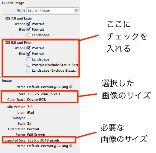 xcode5の場合には、iPadの画像は、ステータスバーを含むサイズが必要なようだった。